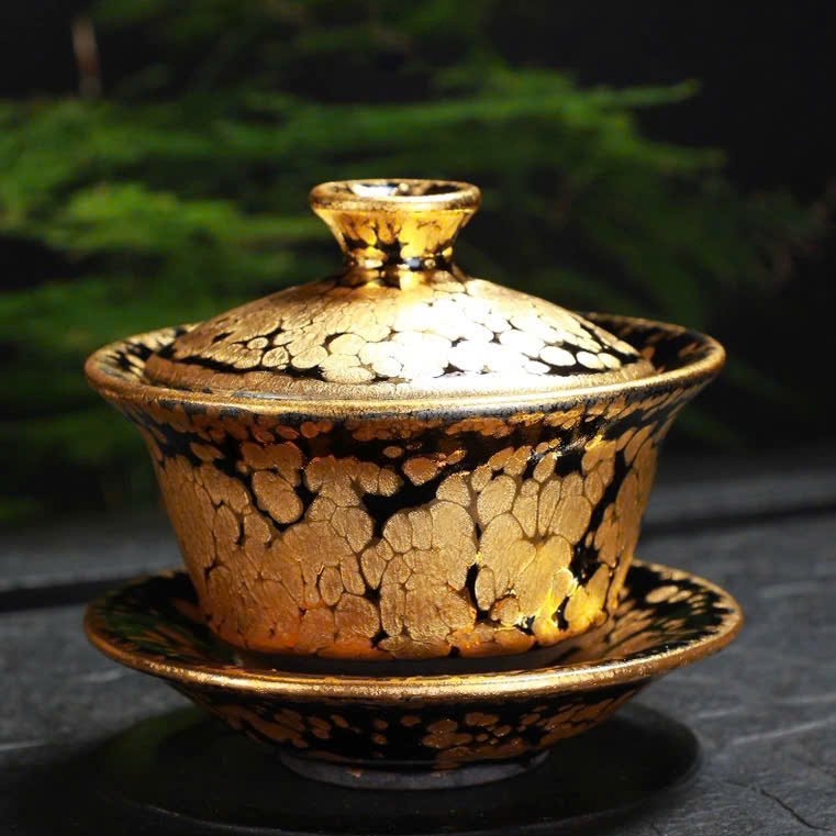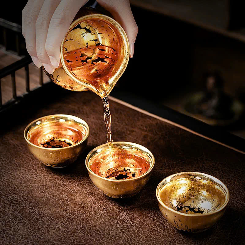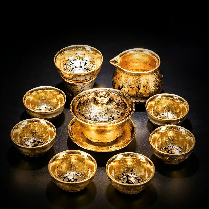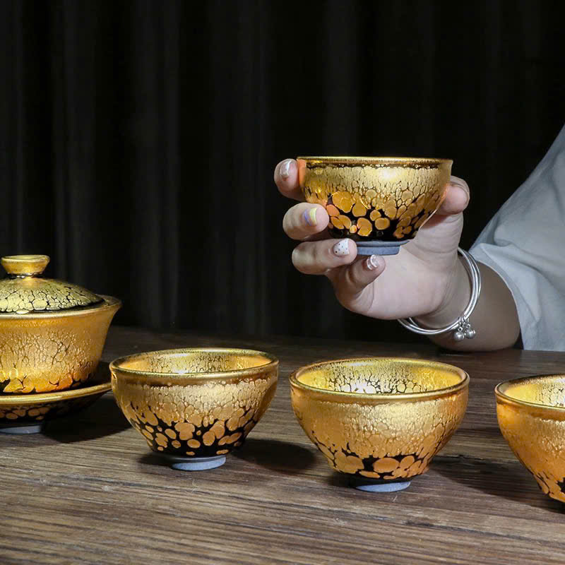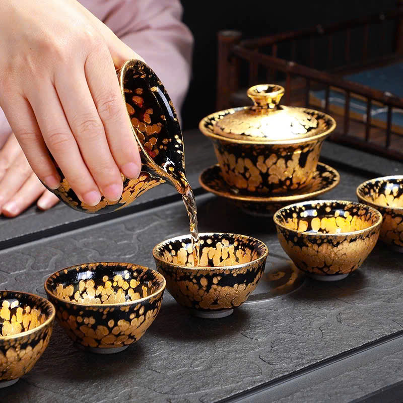 Bộ Ấm Chén Kiến Trản Nung Củi là một tác phẩm nghệ thuật độc nhất vô nhị. Lớp men Du Trích với những đốm loang màu trắng hoặc nâu tựa như những giọt dầu đang chảy trôi, tạo nên những họa tiết tự nhiên, mềm mại. Khi ánh sáng chiếu vào, những hoa văn này lại càng trở nên sống động và lấp lánh, mang đến một trải nghiệm thị giác vô cùng thú vị.